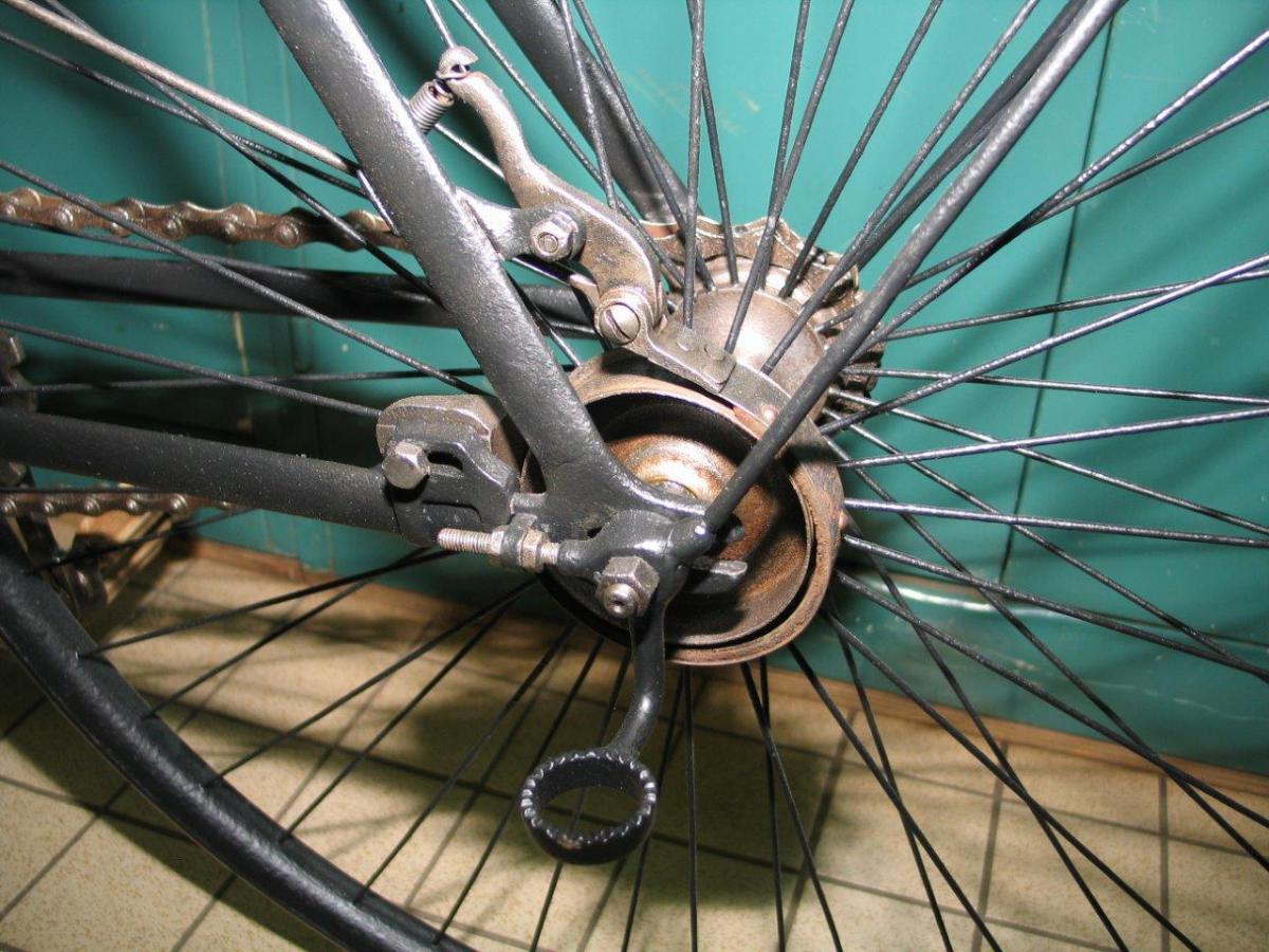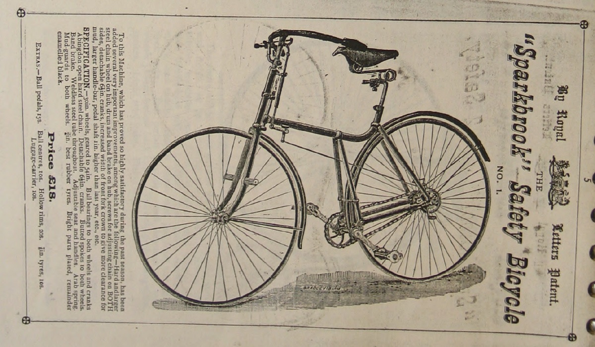 From 1888 until 1891 or maybe even 1892 Sparkbrook built safety bicycles with this very interesting frame. There were different models. This no.1, as featured uin the 1888 catalogue, has a rather sophisticated rear band brake. The no.2 had a front wheel spoon brake.